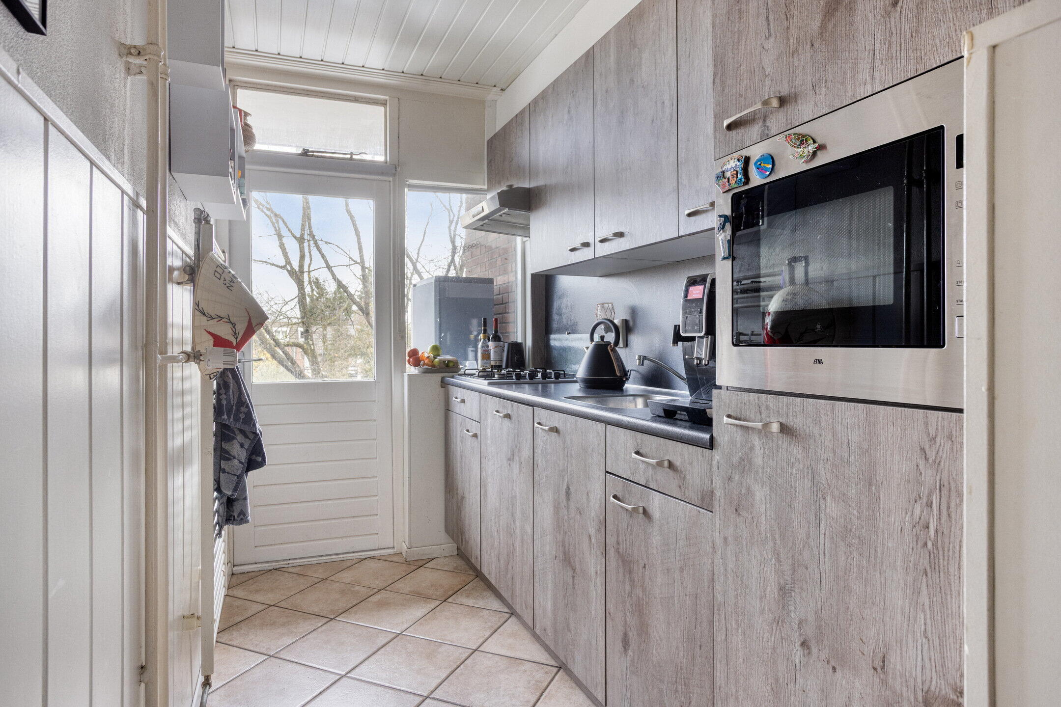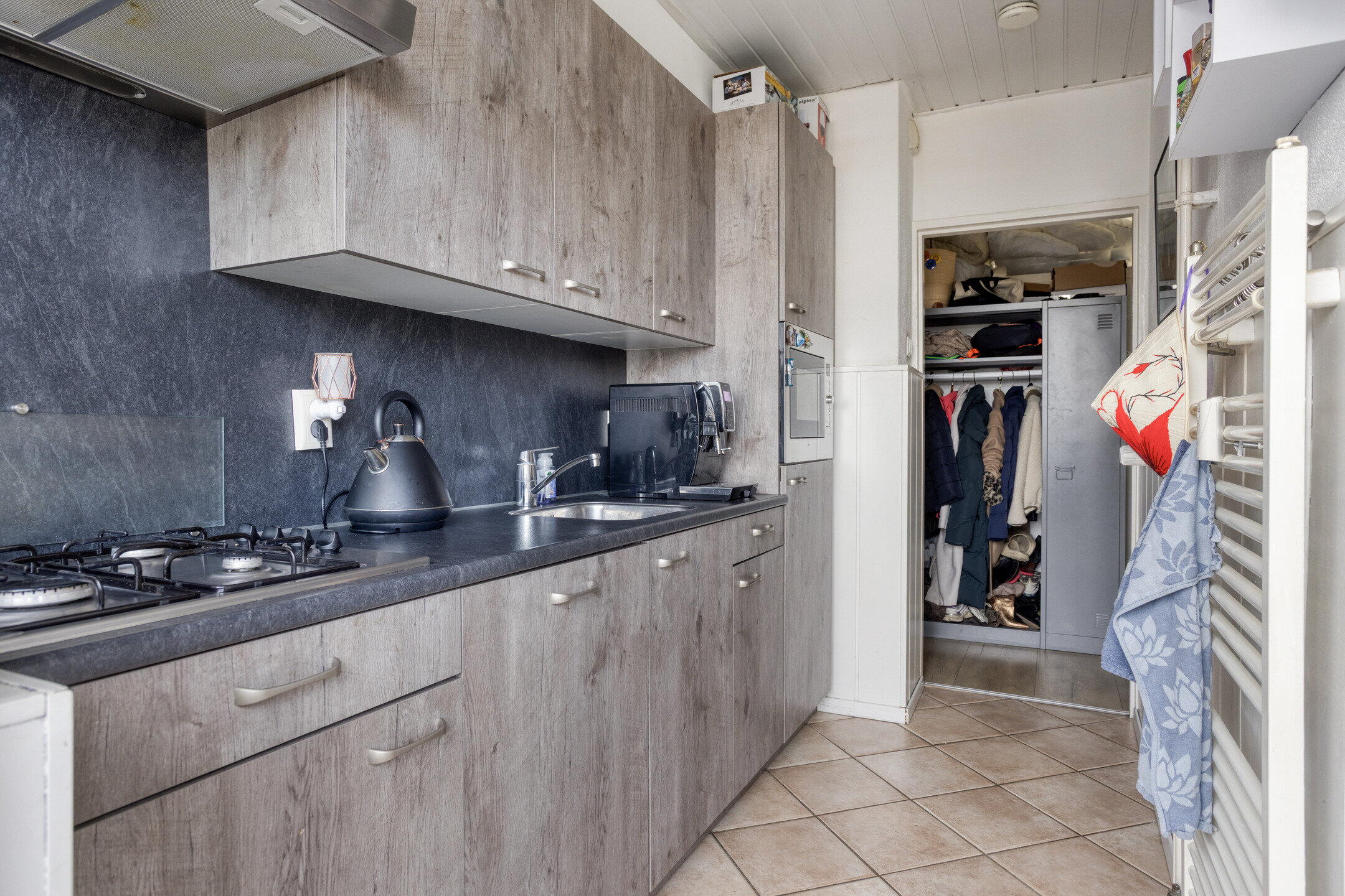 De woonkamer is gezellig en praktisch ingedeeld. Dankzij de grote raampartij en de toegang tot het balkon geniet je hier van een prettige lichtinval. Er is voldoende ruimte voor een comfortabele zithoek waar je heerlijk kunt ontspannen én voor een 4-persoons eettafel om gezellig te tafelen met vrienden of familie. De gesloten keuken is uitgevoerd in een houtkleur met een donker werkblad, wat zorgt voor een sfeervolle uitstraling. De keuken is voorzien van een fornuis, afzuigkap, combi-oven, koelkast en vaatwasser. Vanuit de keuken heb je toegang tot het tweede balkon, ideaal om ’s ochtends even een frisse neus te halen of rustig te genieten van een kop koffie.