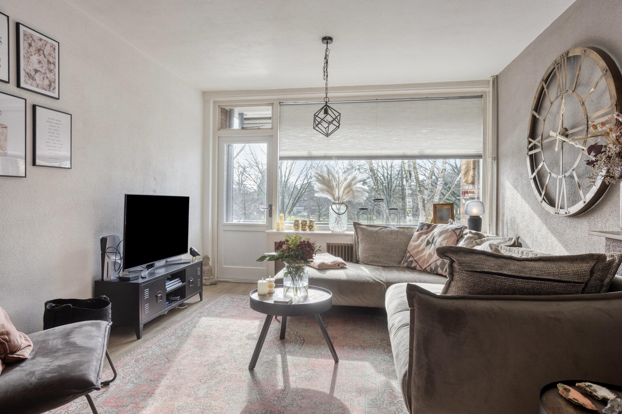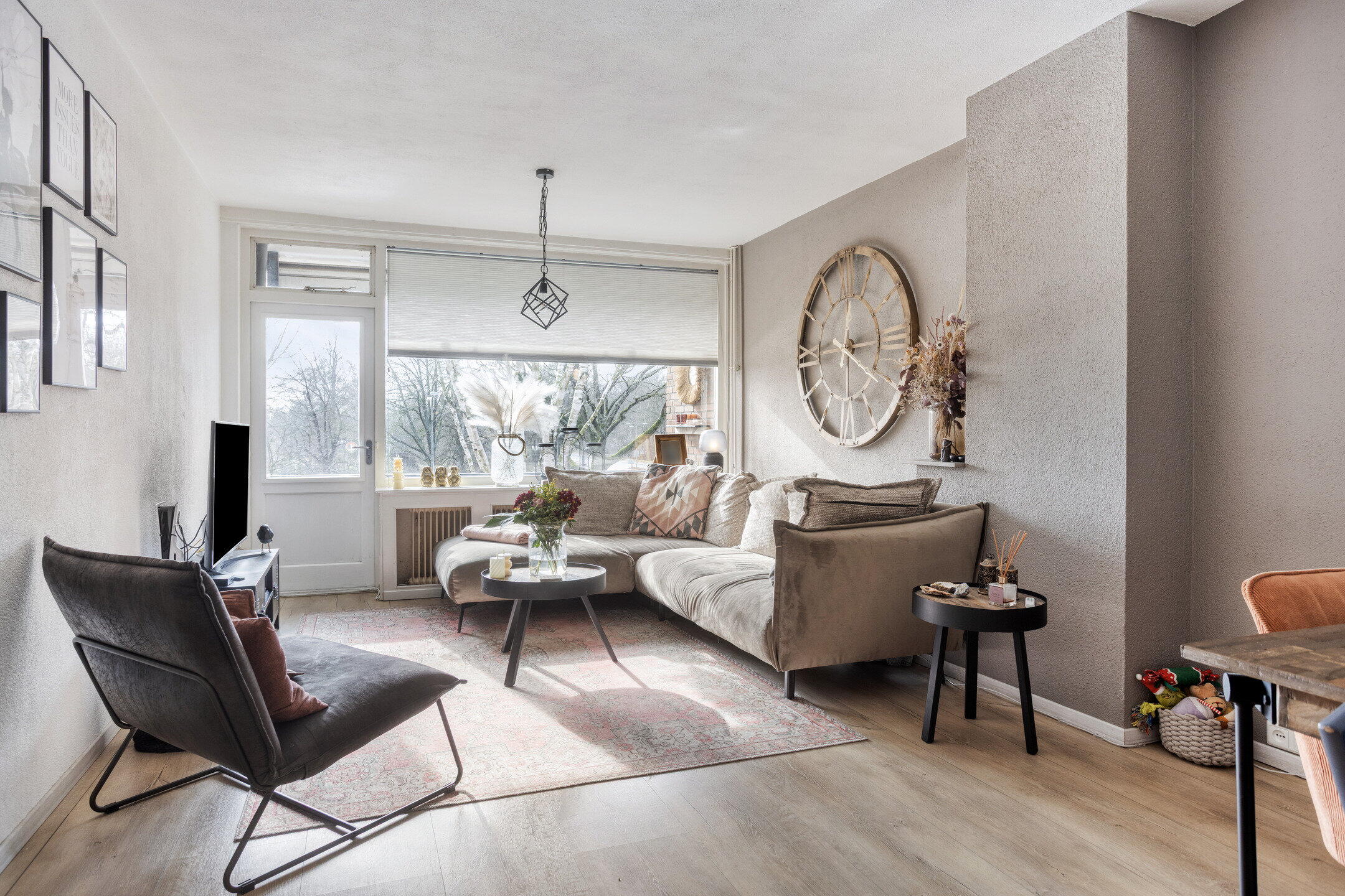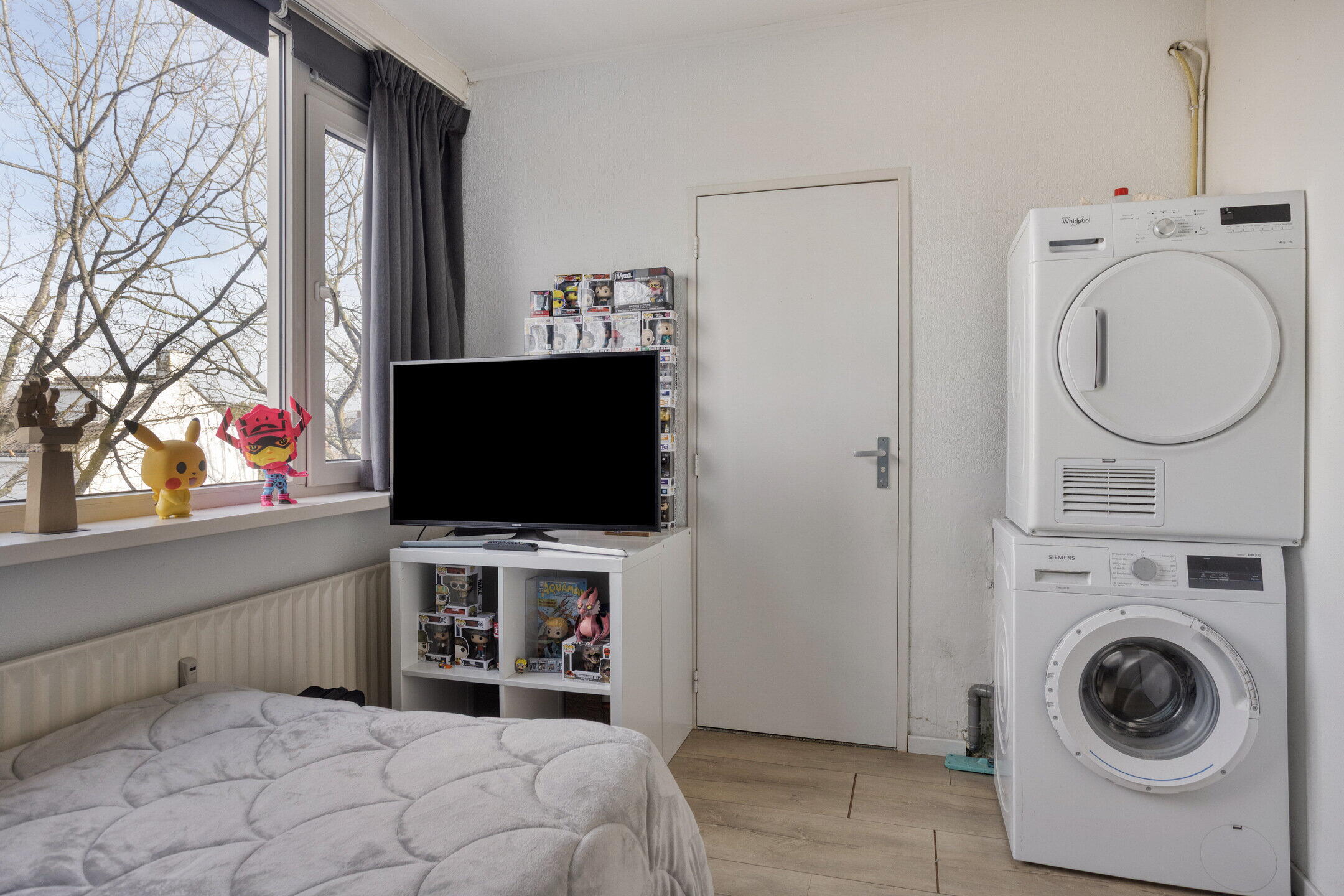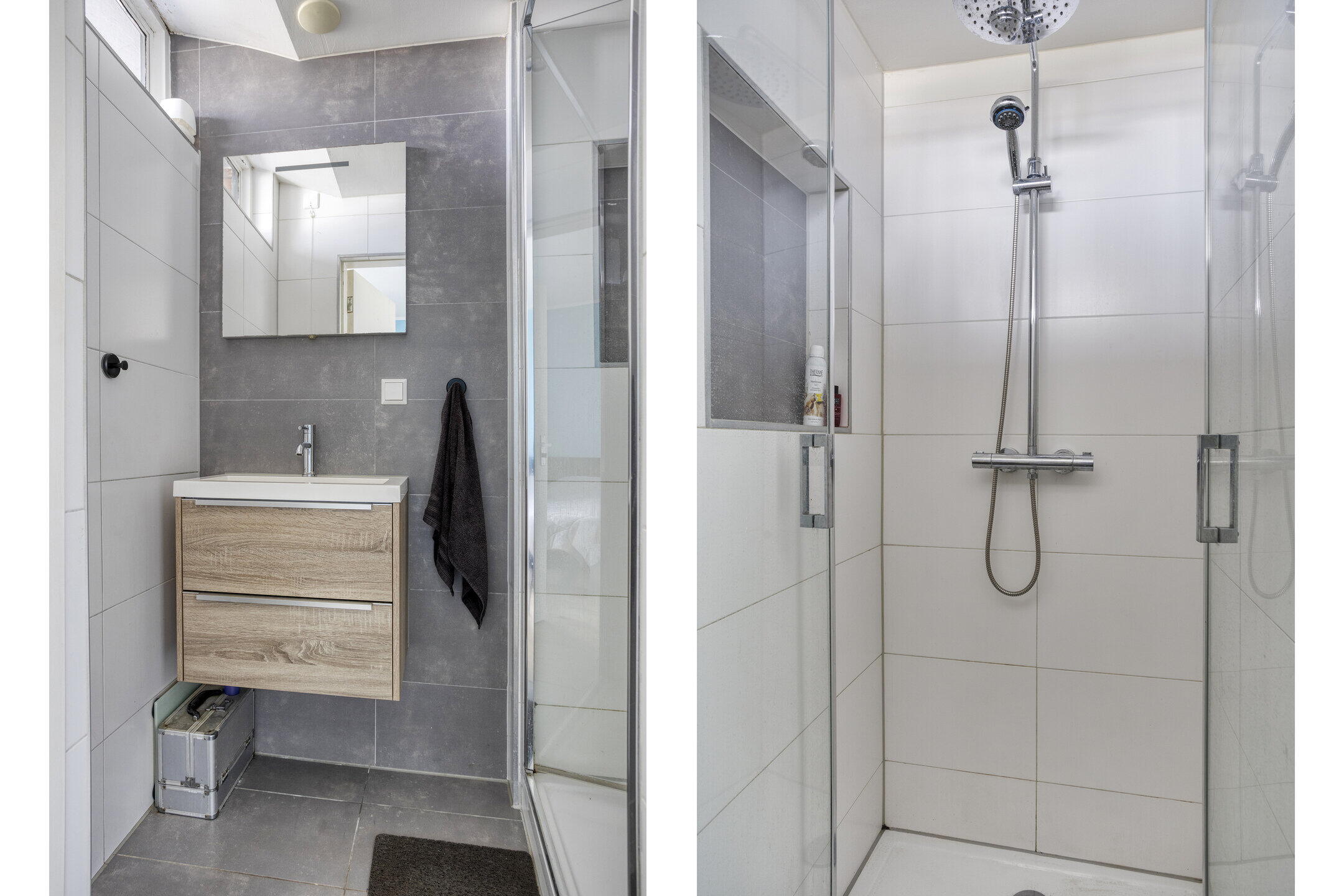 Het appartement beschikt over twee slaapkamers. De grootste slaapkamer, bereikbaar via de hal, biedt voldoende ruimte voor een tweepersoonsbed en een kledingkast. Een fijne, rustige plek om je terug te trekken na een lange dag. De tweede slaapkamer, bereikbaar via de woonkamer, is iets compacter maar praktisch in te richten met een eenpersoonsbed en een kast of bureau. Hier bevinden zich tevens de aansluitingen voor de wasmachine en droger. De badkamer is bereikbaar via deze tweede slaapkamer en is netjes afgewerkt met betonlook grijze tegels in combinatie met witte wandtegels. Het houtlook wastafelmeubel geeft de ruimte een warme uitstraling. De badkamer beschikt over een douche en wastafel met meubel.